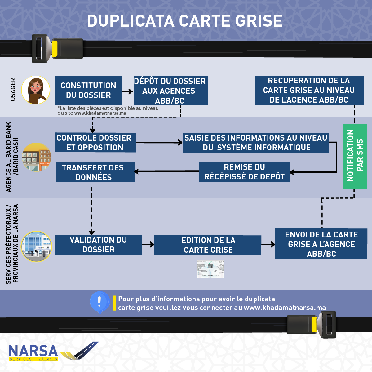 Le demandeur d’un duplicata du certificat d’immatriculation doit déposer, contre récépissé de dépôt valable 60 jours, un dossier de duplicata du certificat d’immatriculation (carte grise) auprès des agences Al Barid Bank/Barid Cash du lieu de sa résidence.